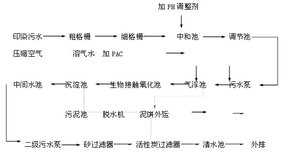 印染污水經(jīng)粗、細(xì)格柵除懸浮物、漂浮物及大顆粒的雜質(zhì)等之后,進(jìn)入中和池,由加藥裝置加入PH調(diào)整劑,進(jìn)行調(diào)整污水的PH值;達(dá)到中性后,進(jìn)入污水調(diào)節(jié)池,由調(diào)節(jié)池調(diào)節(jié)污水的水量及水質(zhì),并進(jìn)行預(yù)曝氣處理,調(diào)節(jié)之后的污水由污水提升泵提升到氣浮裝置(泵前投加凝絮劑和助凝劑),經(jīng)溶氣水作用,達(dá)到固液分離的效果。浮渣由刮渣機(jī)運(yùn)作排入?yún)R集于污泥濃縮池中處理,上清液自流入生物接觸氧化池,加入空氣使氧化池內(nèi)的填料上生長出好氧菌,并活躍生長,以此去除水中的有機(jī)物質(zhì),達(dá)到凈化的目的。 經(jīng)好氧處理之后的污水進(jìn)入二次沉淀池中,再進(jìn)行固液分離,上清液進(jìn)入中間水池,污泥匯集于污泥池中處理,中間水池的污水由污水泵抽入砂過濾器進(jìn)一步去除水中的SS等物質(zhì),再進(jìn)入活性炭過濾器,利用活性炭的吸附功能,對污水中的色度及有機(jī)物質(zhì)進(jìn)行吸附過濾,使污水達(dá)標(biāo)排入清水池中排放。 清水池兼作砂過濾器和活性炭過濾器的反沖洗水池。 對于氣浮池中的浮渣、沉淀池中的污泥、過濾器的反沖排污都匯集于污泥濃縮池中進(jìn)行濃縮處理,再進(jìn)行污泥脫水機(jī)處理,上清液回流至調(diào)節(jié)池中再處理,泥餅外運(yùn)埋填。